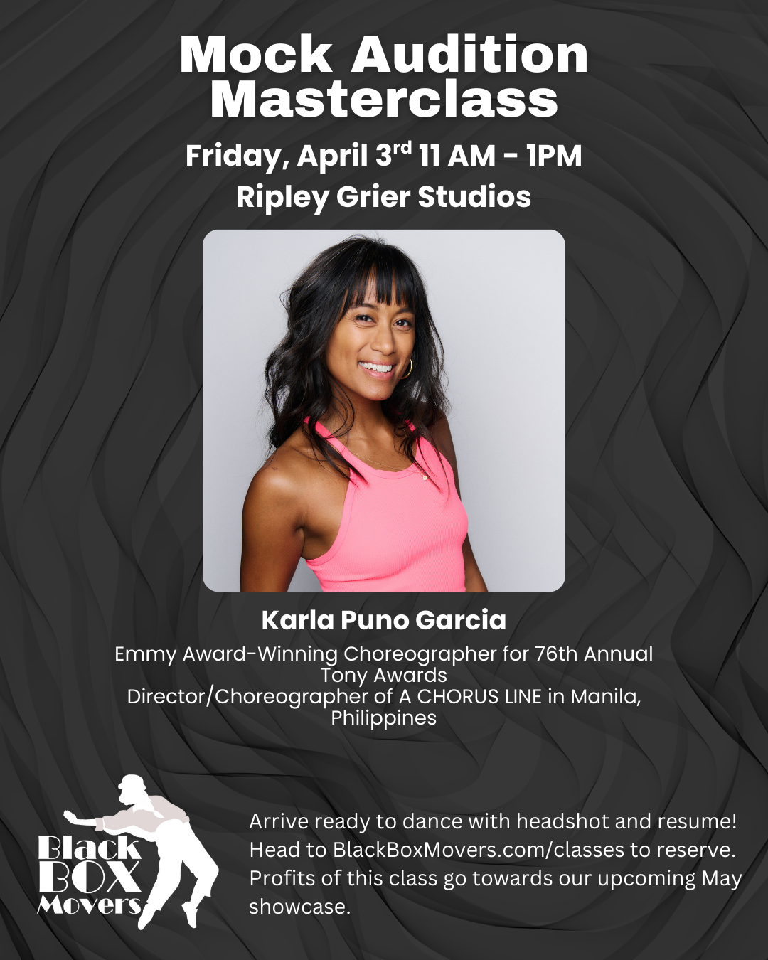 Join us for a Mock Audition Masterclass with Emmy Award Winning Choreographer, Karla Puno Garcia to receive advice, learn what happens behind the table, and take the time to coach your dance audition. Dancers will have the chance to dance and receive direct feedback and dance twice.