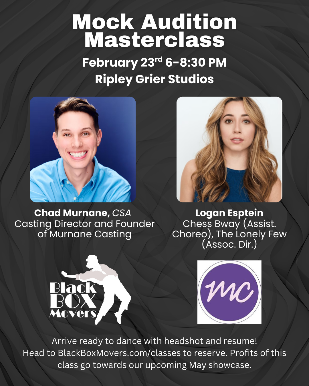Join us for a Mock Audition Masterclass with Logan Epstein (Chess Broadway Assist. Choreo., High Spirits Assoc. Choreo.) and Chad Murnane, CSA (Murnane Casting) to receive advice, learn what happens behind the table, and take the time to coach your dance audition. Dancers will have the chance to dance and receive direct feedback, and then have the space for a Q&A at the end of the class.